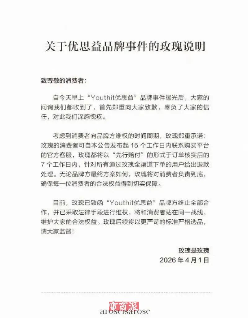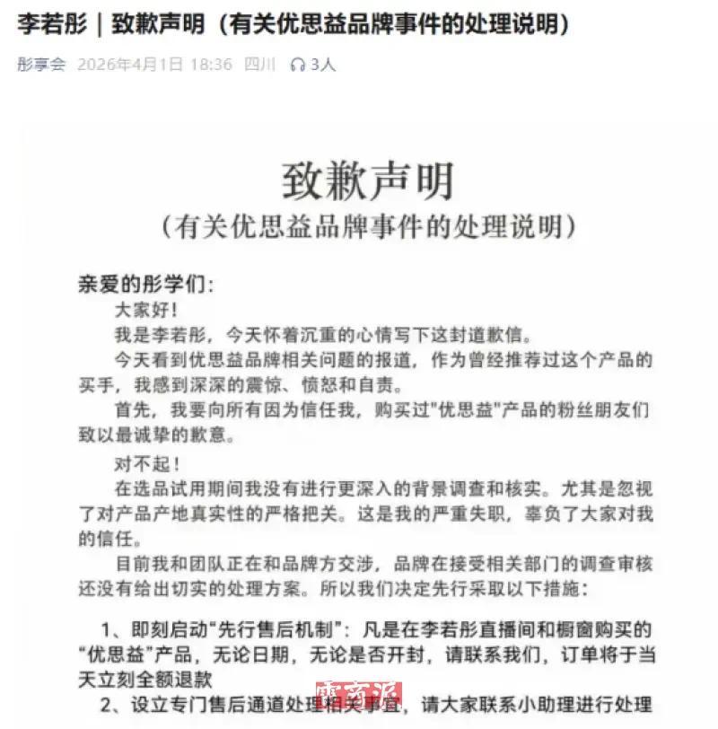 李若彤方表示:凡是在李若彤直播间和橱窗购买的“优思益”产品,无论日期,无论是否开封,请联系我们,订单将于当天立刻全额退款。