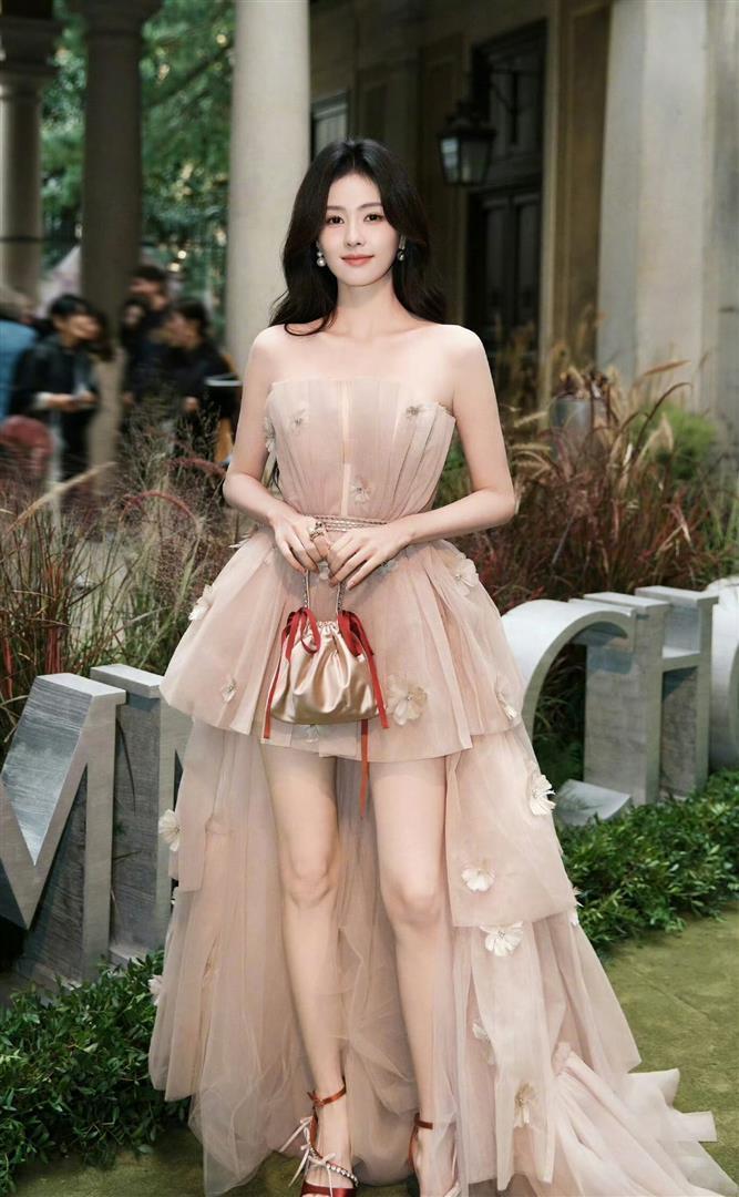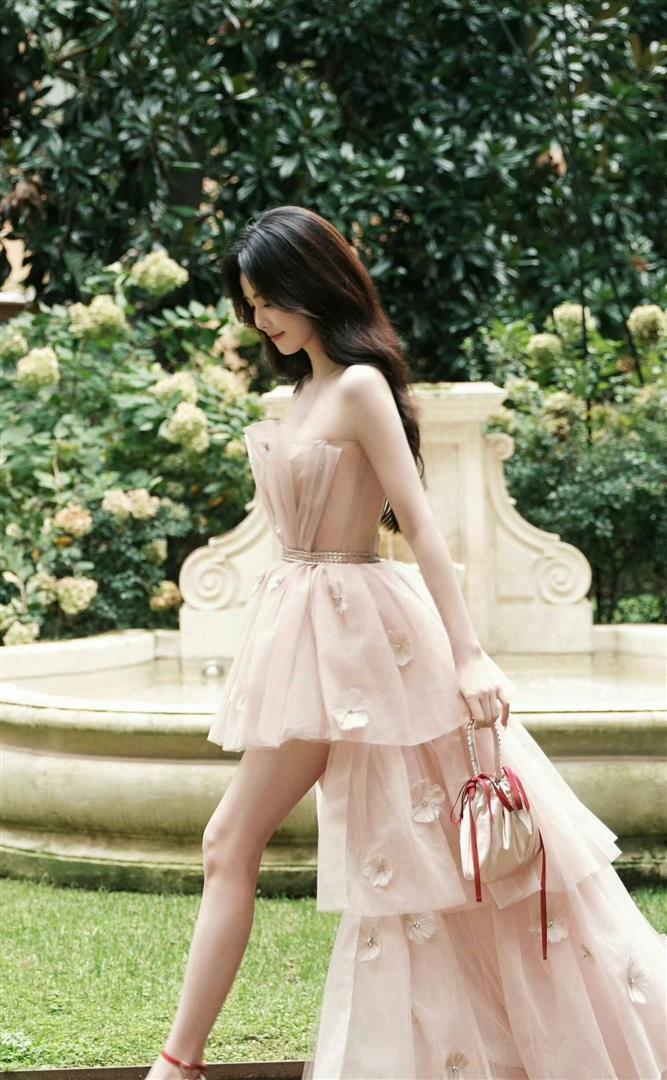 先说说这条裙子。 裸粉色的抹胸蓬蓬裙,上半身是压褶设计,把天鹅颈和直角肩全露出来了。 裙摆更有意思——短款蓬蓬裙加长拖尾纱裙,走起路来一高一低,轻盈得像踩在云上。